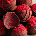- Dip and Decorate: Dip each truffle ball into the melted chocolate to coat completely. Immediately sprinkle a pinch of the reserved crushed freeze-dried strawberries on top for garnish.