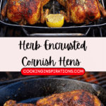 Discover a flavorful twist for your Thanksgiving feast with these Herb Encrusted Cornish Hens cooked over Cowboy Charcoal for a smoky, tender main course. The combination of fresh herbs, garlic, and a hint of smoked paprika enhances the juicy cornish hens, while golden roasted russet potatoes complete this hearty American meal.