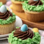 Fill piping bags with both frostings—use your favorite tips to layer green buttercream at the base of each cupcake as “grass,” then swirl the chocolate buttercream on top to resemble a bird’s nest. To complete the look, gently place 3 or 4 whole mini eggs on each cupcake, nestling them into the chocolate frosting. This final step not only makes these cupcakes visually stunning but also boosts their festive appeal.