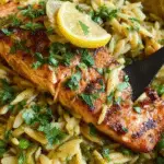 A quick and flavorful one skillet salmon dish featuring pan-seared salmon fillets served atop lemony orzo pasta cooked with fresh spinach and Parmesan cheese. This easy all-in-one meal combines protein, greens, and creamy orzo for a satisfying dinner perfect for busy weeknights.
