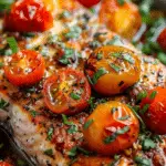 A fresh and elegant pan-seared salmon dish topped with juicy roasted cherry tomatoes, delivering crisp texture, bright flavor, and a healthy, satisfying meal with minimal effort.
